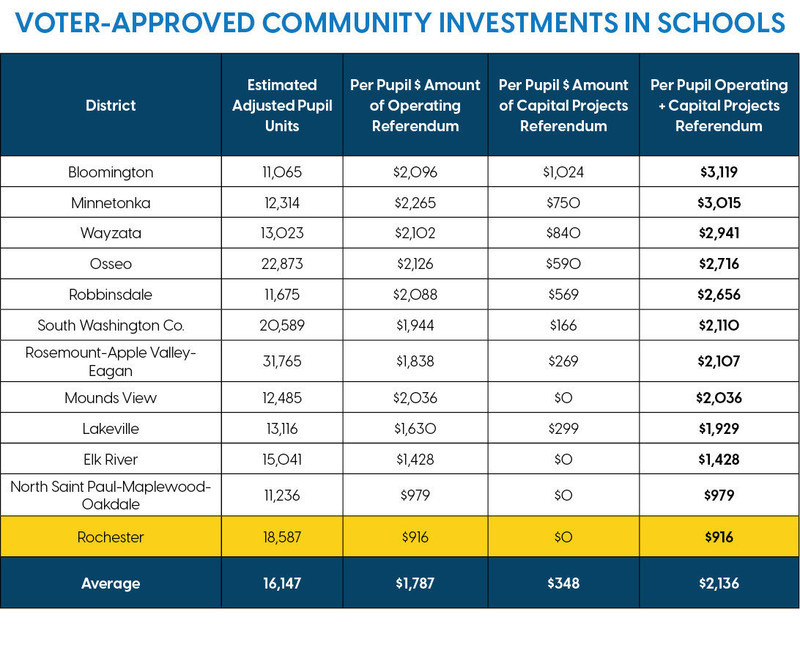Many of the people I spoke with were surprised that Rochester Public Schools is so far behind other comparable Minnesota school districts in local funding from voter-approved operating and capital projects referendums. They agreed that the other school districts listed on the table are ones that Rochester Public Schools should compare itself to – not just in the amount of funding we receive, but also in the quality of the educational programs we offer and the educational outcomes our students achieve.
